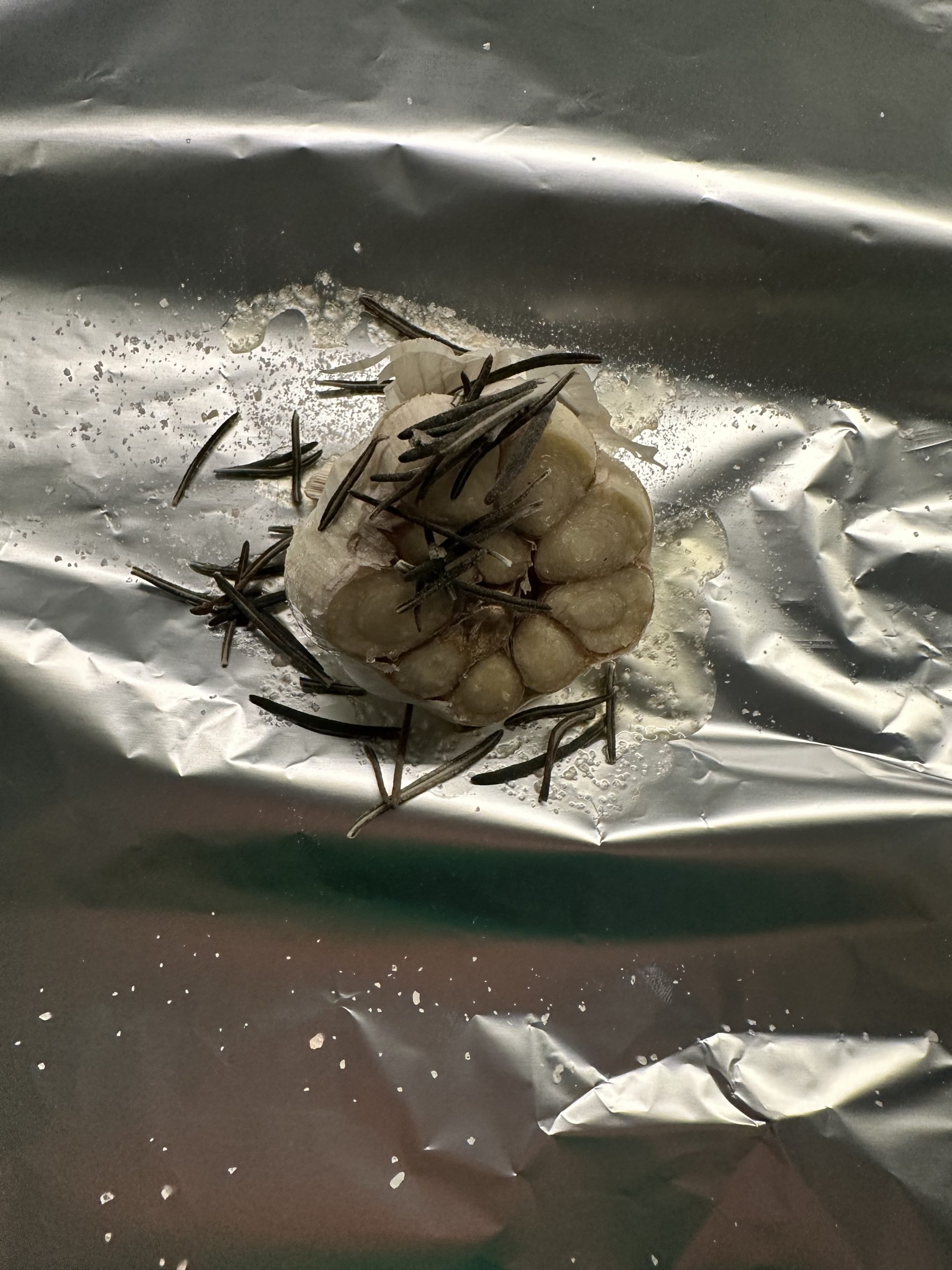 - Drizzle with a little olive oil, sprinkle with salt, and tuck in a sprig of rosemary. Wrap in foil.