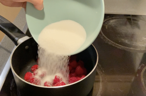 - In a small saucepan, cook the raspberries and sugar over low heat for 5 minutes.