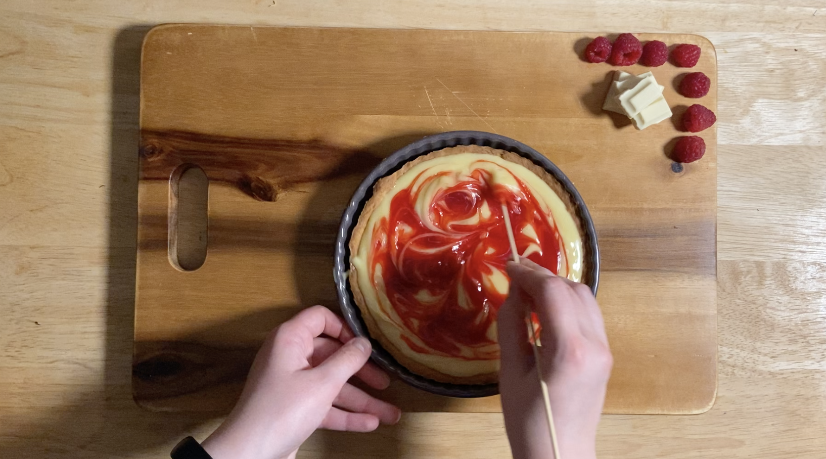 - Add small dollops of raspberry coulis over the surface and use a skewer to gently swirl into a marble pattern. Be careful not to overwork it.