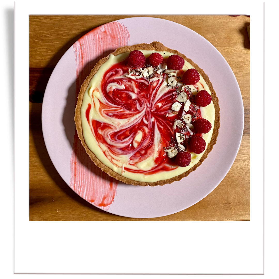 I created this tart for one of those days when I wanted something beautiful, light, and indulgent. The kind of dessert you serve at the end of a long lunch or bring out as a surprise for guests. And when you cut into it — with that crisp shortcrust base, silky white ganache, and striking raspberry swirl — it gets quiet around the table in the best way.